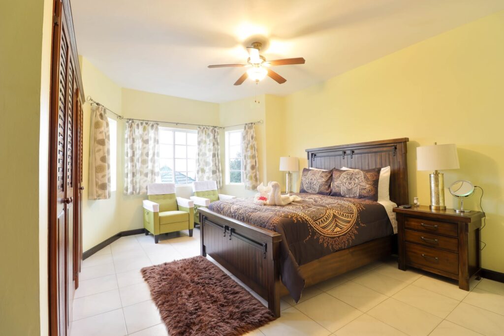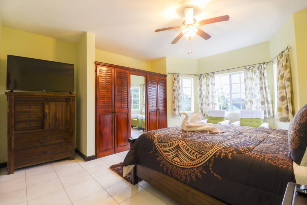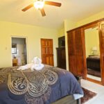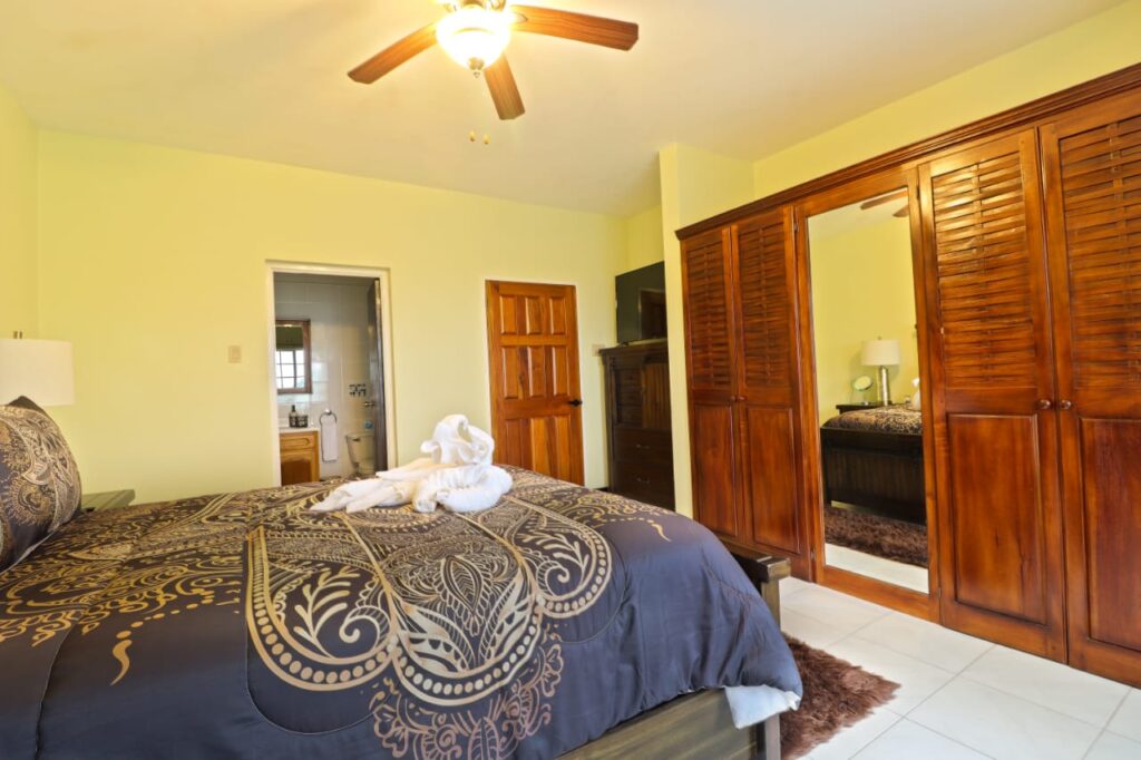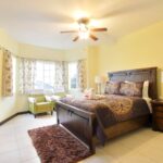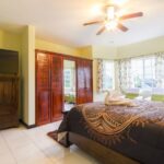 This luxurious suite is a stunning masterpiece of design and comfort. The plush queen-sized bed sits centrally in the room, adorned with silk sheets and an assortment of pillows. The walls are coated in a regal shade of turquoise-creme, and the windows are draped with curtains that evoke a tropical sentiment.